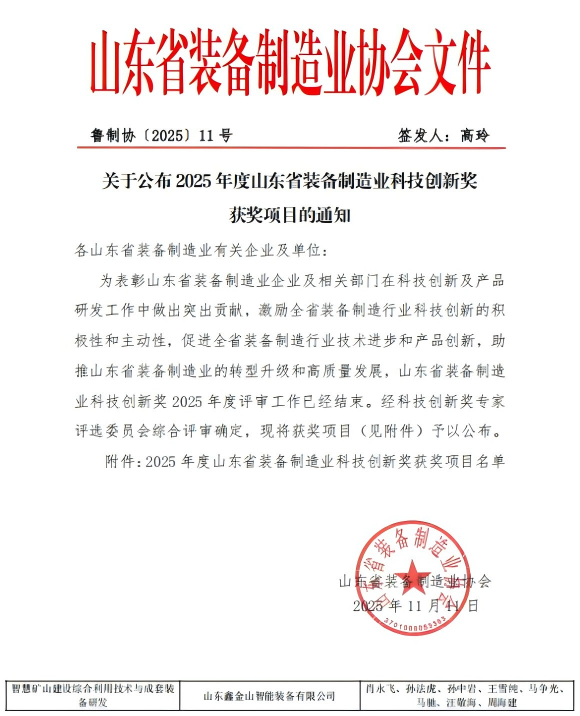 山东省装备制造业科技创新奖是全省装备制造行业科技创新的最高荣誉之一,旨在表彰在技术研发、产品创新中作出突出贡献的企业与项目,助力全省装备制造业转型升级与高质量发展。本次评选经专家评审委员会严苛审核,从数百个申报项目中择优遴选,鑫金山凭借扎实的技术积累、突破性的创新成果,成功跻身一等奖榜单,彰显了公司在矿山装备领域的硬核实力。
