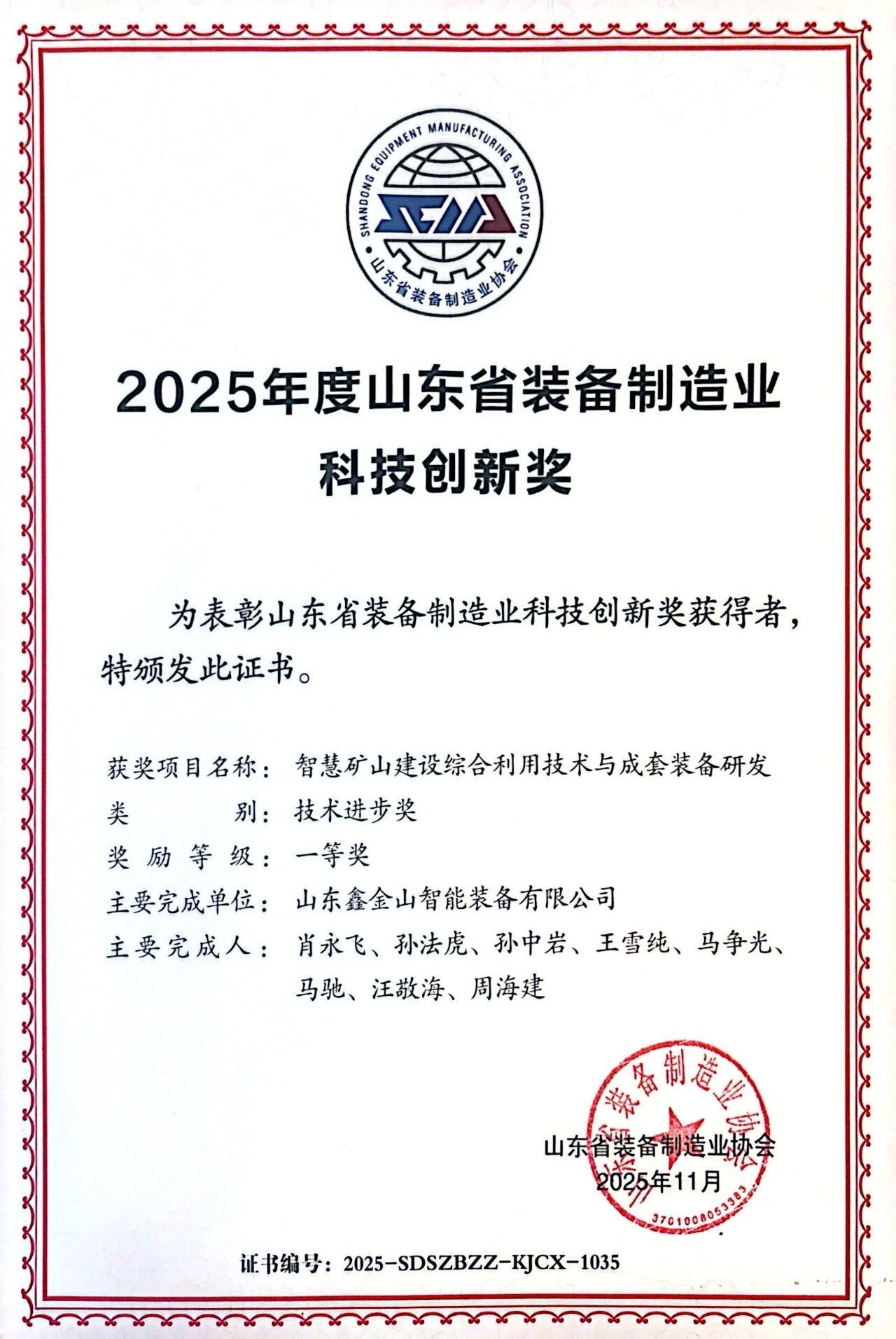 近日,山东省装备制造业领域传来重磅捷报 —— 由山东鑫金山智能装备有限公司自主研发的 “智慧矿山建设综合利用技术与成套装备研发” 项目,在 2025 年度山东省装备制造业科技创新奖评选中脱颖而出,荣膺一等奖!这一省级权威荣誉,是对鑫金山科技创新实力的高度认可。