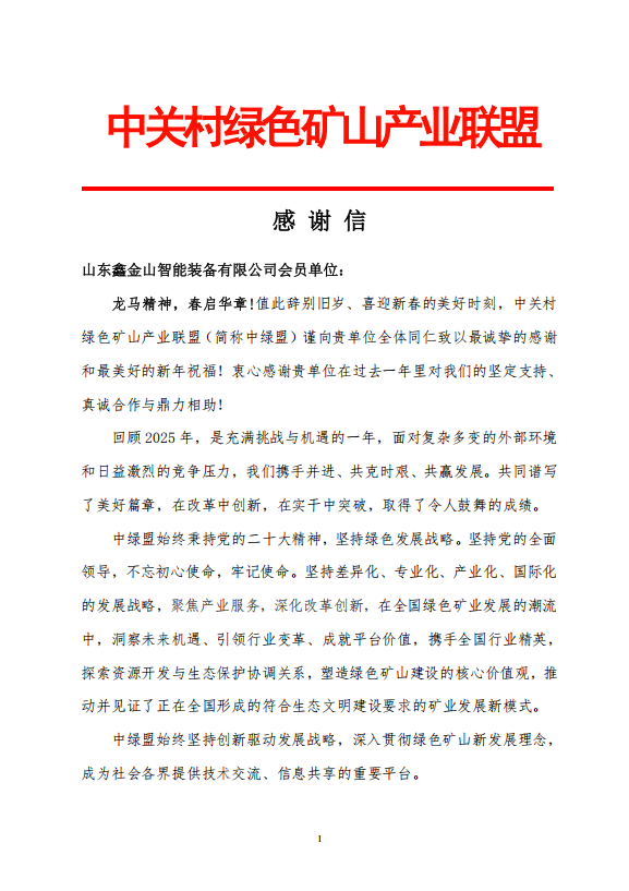 导读:新春将至!近日,山东鑫金山智能装备有限公司收到中关村绿色矿山产业联盟(中绿盟)发来的感谢信,字里行间满含认可与期许,这是联盟对鑫金山深耕绿色矿山领域、积极助力行业