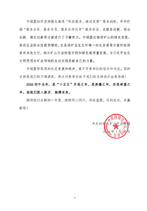 此次中绿盟在感谢信中,对鑫金山的坚定支持与真诚合作表达诚挚谢意,并展望 2026 丙午马年 “十五五” 开局新征程。未来,鑫金山将继续秉持绿色发展初心,以技术创新驱动行业变革,与中绿盟及行业同仁携手共进,深耕智能矿山装备研发与应用,为矿业领域生态文明建设贡献更多力量,共绘绿色矿业高质量发展新蓝图,在新征程上马到成功、共赢新程!
